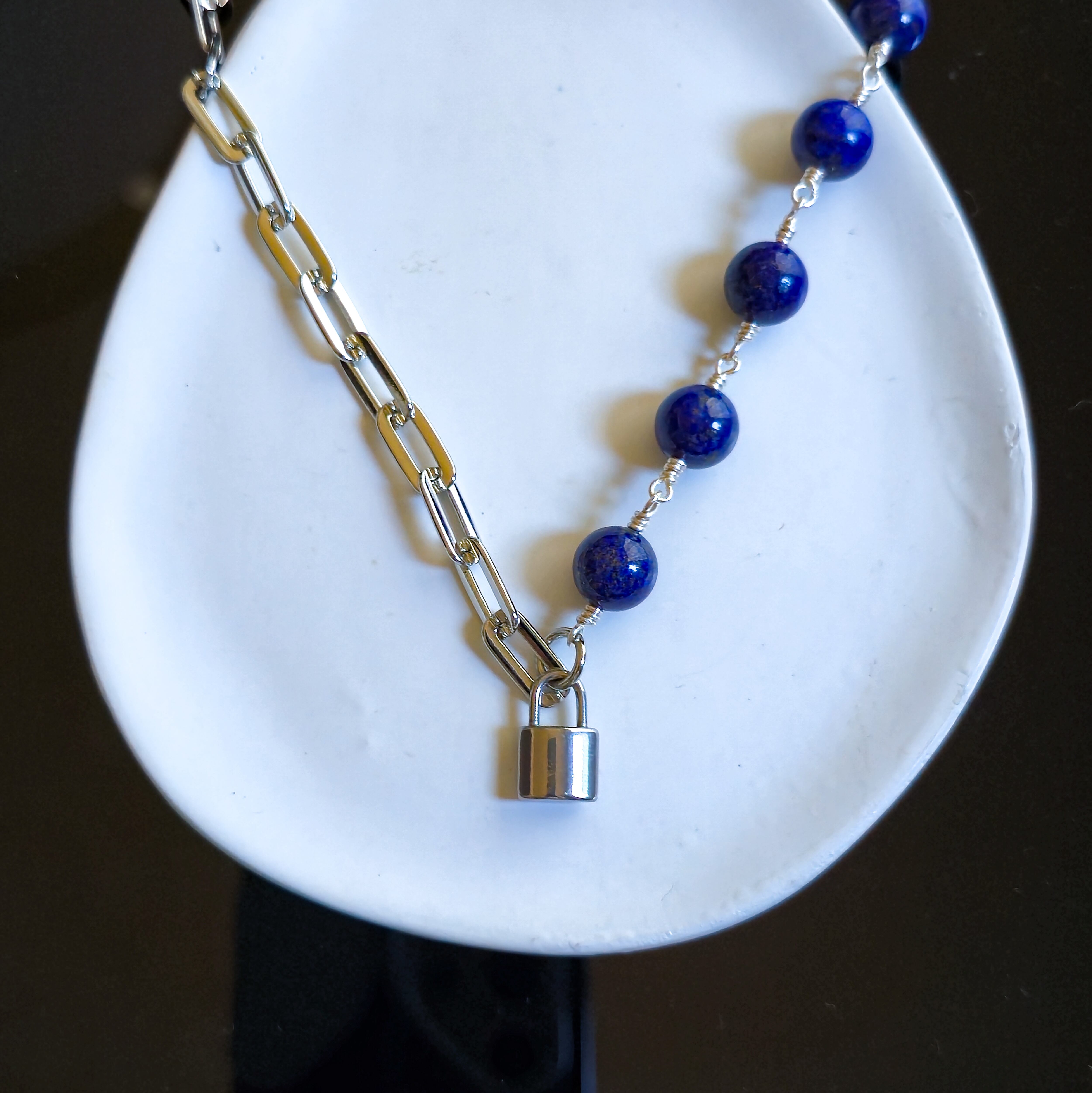 ステンレス製の縦10mm横5mmのあずきチェーンと10mmの天然石ラピスラズリのネックレスです。