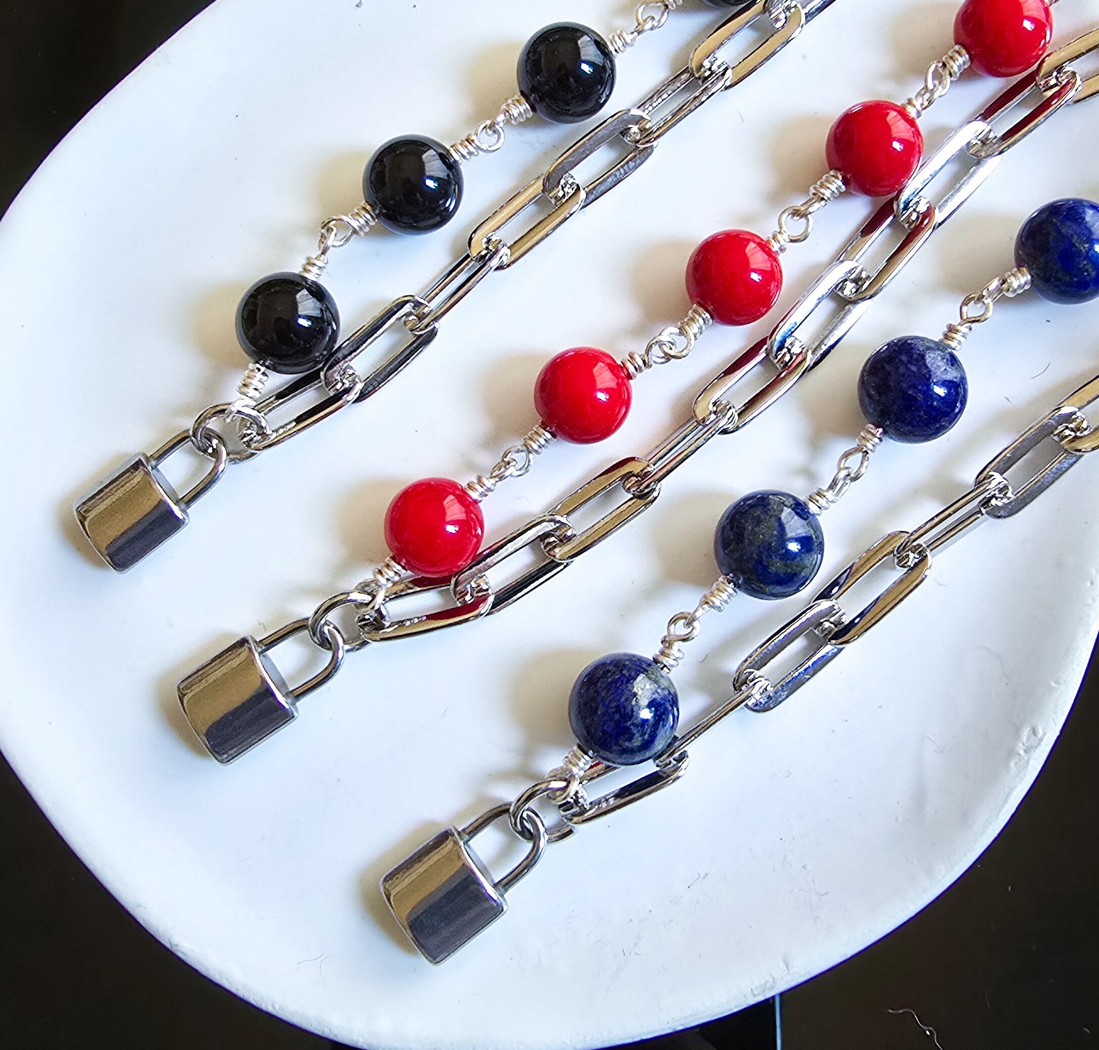 天然石違いといいますか、色違いのオニキス(黒)と珊瑚(赤)もありますので是非見てくださいね!