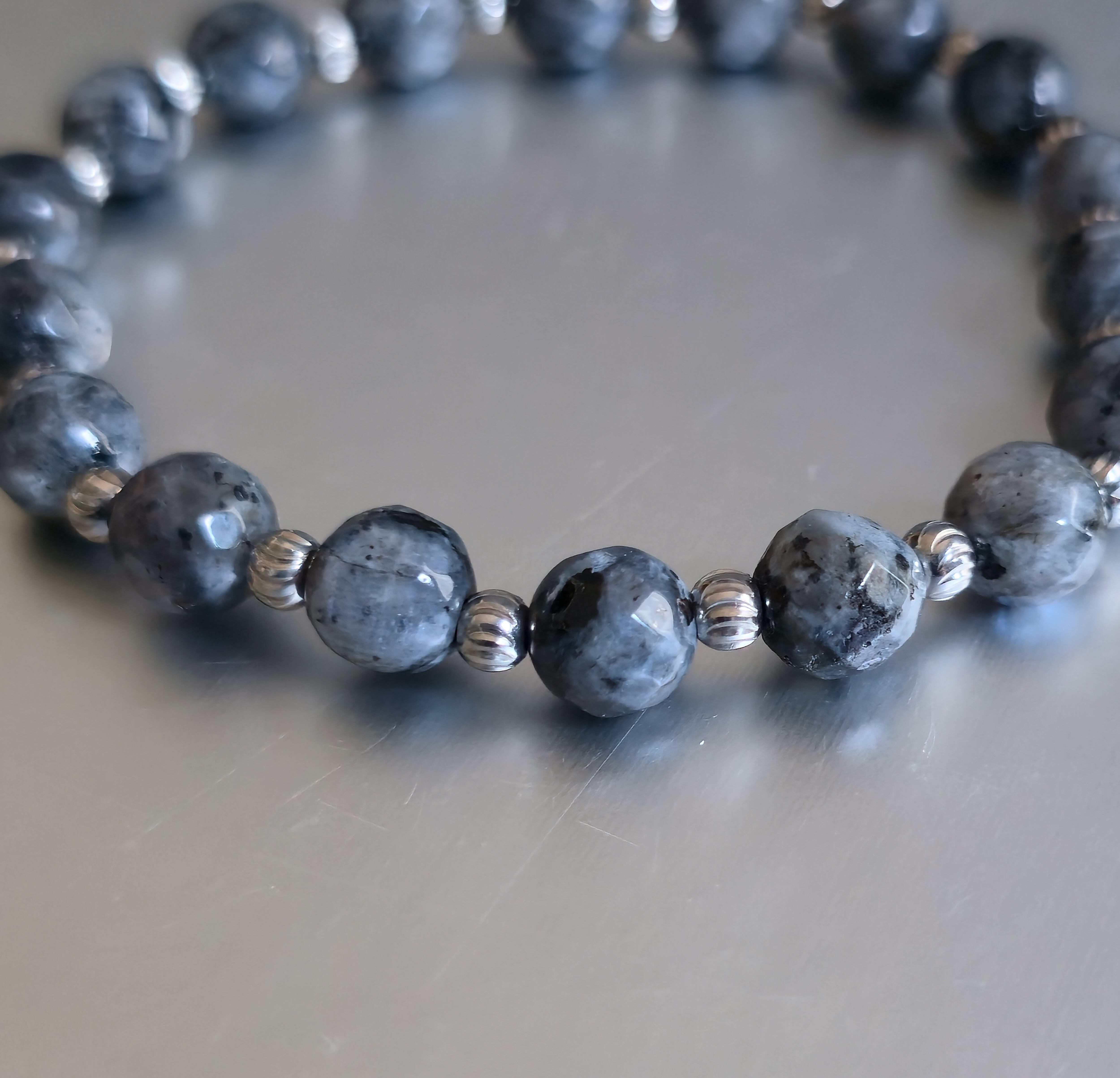 ラルビカイトは、ノルウェー産の鉱物で、黒やグレーの地色に、ラブラドライトに似た青や銀白色の輝き(シラー)が見られるのが特徴です。