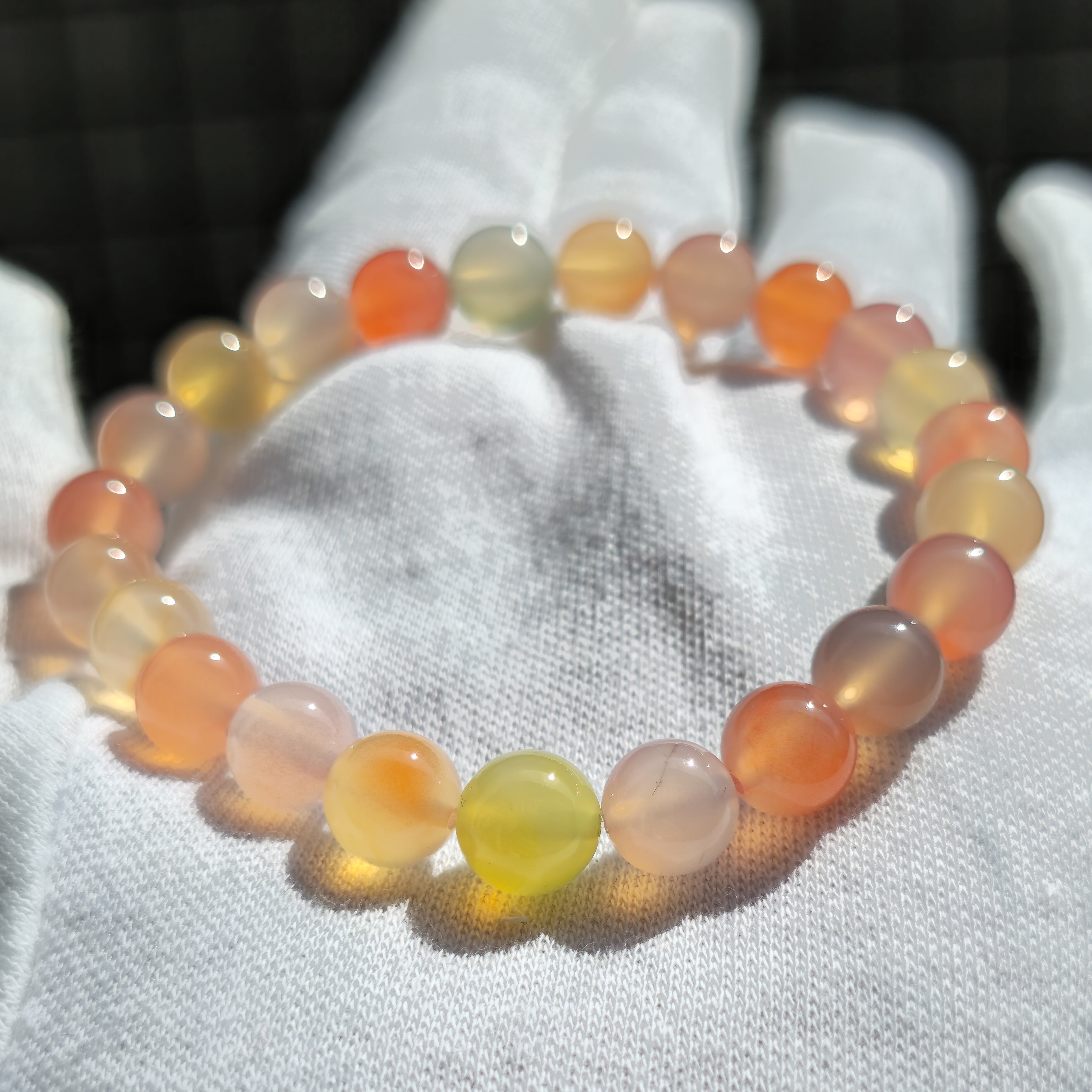こちらは、中国の四川省でのみ産出される、非常に希少な瑪瑙です。一般的な瑪瑙とは異なり、まるでキャンディのような、柔らかなパステルカラーのグラデーションが魅力です。ピンク、イエロー、グリーン、ブルー、そしてホワイトが混ざり合う、唯一無二の模様は、この石が持つ自然の美しさを物語っています。